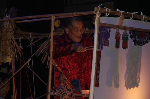市级代表性传承人吴升平老人在进行精彩的纸影戏表演。