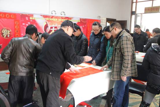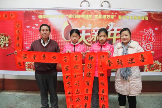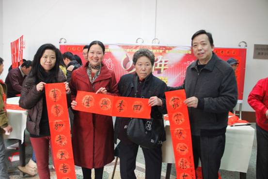 为迎接中国传统节日——春节,丰富广大读者的文化生活,营造一个欢乐祥和、文明健康的氛围,市图书馆(少儿馆)特举办“我们的中国梦●文化进万家”春节惠民活动……万幅春联送万家活动(图书馆分会场)以飨读者。一楼大厅里人群熙熙攘攘,书桌上,书法名家挥毫泼墨,为读者书写、赠送春联。我馆特邀请市书法协会会员、市政协秘书长许服民、会员吴有明、董庆国老师以及一批书法爱好者为大家书写春联。大家围在桌旁,欣赏老师精湛的技艺,并请老师写下自己喜爱的春联。读者拿到书法家的墨宝都非常开心,高兴地和大伙谈论着自己的春联。“和顺一门有百福,平安二字值千金”、“ 天增岁月人增寿,春满乾坤福满门”、“ 日日财源顺意来,年年福禄随春到”等一幅幅飘着墨香的春联表达了大家对美好明天和幸福生活的真情祝愿。此次送春联活动进行了三个多小时,共计送出春联300多幅,受到了广大读者的热烈欢迎。