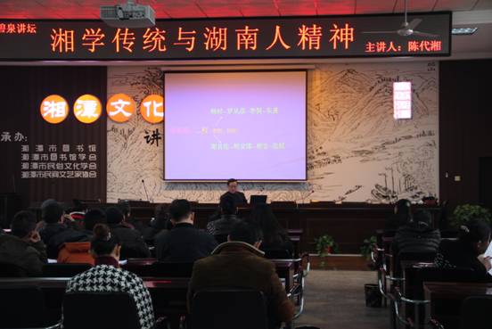 2月10日下午,湘潭大学哲学系教授、博士生导师陈代湘教授在湘潭市图书馆三楼多功能报告厅给大家做了一场题为《湘学传统与湖南人精神》的讲座。
