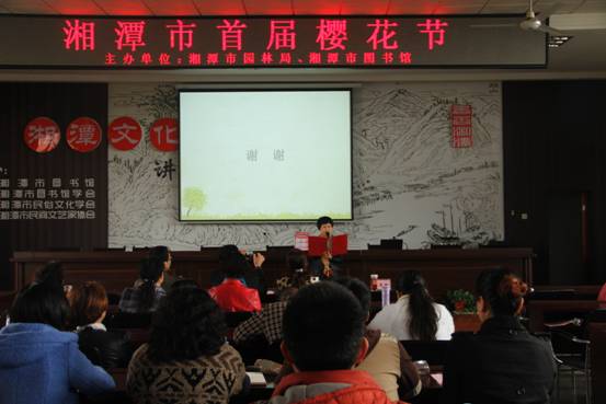 此次讲座是“我在樱花树下等你”——湘潭市首届樱花节系列活动之一。樱花节活动由湘潭市园林局、湘潭市图书馆主办,湘潭读书人协会承办,科大团委及菊花塘公园协办。活动从3月25日开始持续到4月20日,包括樱花知识讲座、户外赏花、美文征选、美照征选、评选和颁奖、抽奖等系列活动。欢迎大家积极参加活动!