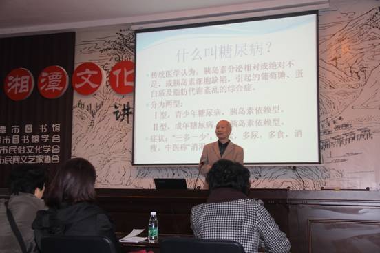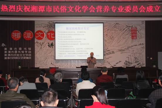 党的十八大提出要全面提高人民健康水平。为了深入研究营养医学,进一步普及健康知识,11月1日上午湘潭市民俗文化学会成立了营养专业委员会,并联合湘潭市图书馆邀请中国营养学会会员,高级营养保健师罗树宾先生,在湘潭市图书馆三楼多媒体放映厅,为广大读者和市民朋友举办了一场关于《糖尿病的预防和营养治疗》的健康讲座。