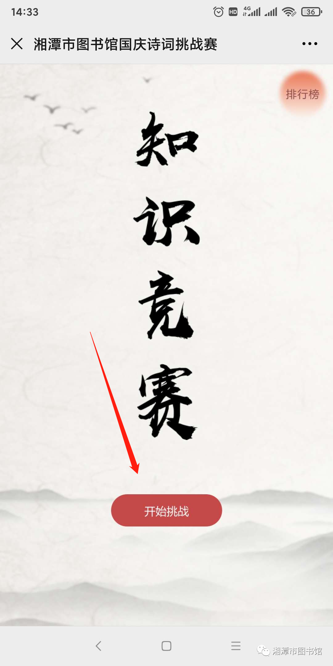 扫描二维码,点击首页面活动图片 “欢度国庆日 诗词共今朝——湘潭市图书馆欢度国庆,诗词挑战赛”界面,开启您的诗词之旅!1.题型说明:总共20道题,每道题的时间为20秒,15道选择题、5道看图猜诗。
