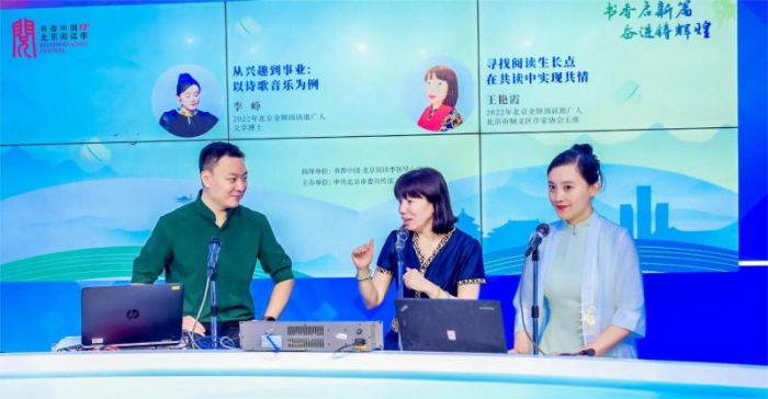 ▲北京广播电视台主持人李锐(左一)和王艳霞(中)、李峥(右一)在“阅读推广方式的创新与实践”主题阅读分享现场