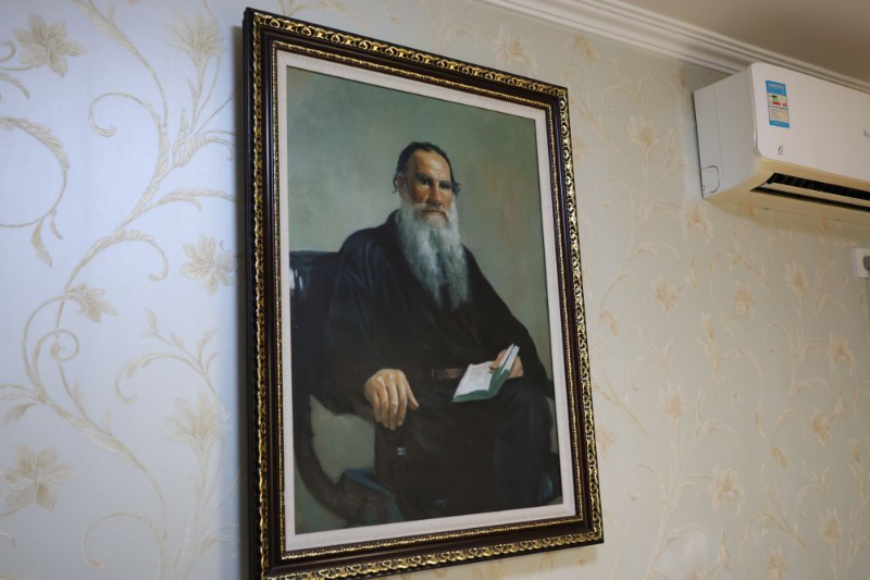 梁晓声书房的一面墙上有几幅充满俄罗斯风情的风景画,另一面墙上是一大幅托尔斯泰画像。画中的托尔斯泰身穿黑色长袍,正襟危坐,深邃的眼眸仿佛在与看画的人对视。