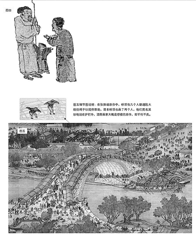 在张择端原作中,桥顶有几个人朝遇险大船扔绳子以提供帮助,清本桥顶也画了两个人,他们莫名其妙地站在护栏外,清院画家大概是想模仿原作,却不伦不类。