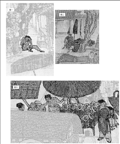 虽然没有什么特别的社会意义、政治意义,或者其他宏大意义,但是对于个人来说,这个大叔却唤醒了我们的某种情感,因此,让我们与张择端产生了情感共鸣。是怎样的情感共鸣呢?请用心看图,他裸露胳膊,衣着简单,是一个中年劳工形象,此时也许是午间,他可能只吃了简单的饭食(旁边是饭馆,他在饭馆外的地上坐着,因此推测他没有进店消费),甚至有可能他连午饭也没舍得吃,只是坐在树下歇会儿,然后就要开始寻找下午的工作。只要我们用心去看他的样子,就知道他是真的累了。为了让读者更加确信他是因为真的疲累而休息,不知有意还是无意,张择端在大叔附近的递铺墙外画了几个睡觉的人,请看图二。其中,有一个靠着大树睡觉的士卒,他翘着腿,双臂围拢,也在睡觉。