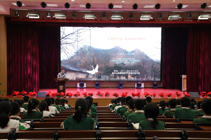 “家书,是的,就是信,与家人沟通的信。我想问问在座各位同学:你有多久没给父亲母亲写信了?今天,我讲的是杜甫的家国情怀,家的温暖与幸福,甚至每个学子的家国情怀,真的可以通过家书来抵达。”6月19日晚,中国作家协会会员、成都市作家协会副主席、杜甫诗传《秋风破》作者彭志强,主讲的第63场杜甫诗学讲座《家书抵万金:杜甫的家国情怀》,在成都树德中学博瑞实验学校学术报告厅举办。据悉,这是该校举办的人文讲堂第二期主题讲座,旨在特邀文学名家走进校园,打开中学生的文学视野。